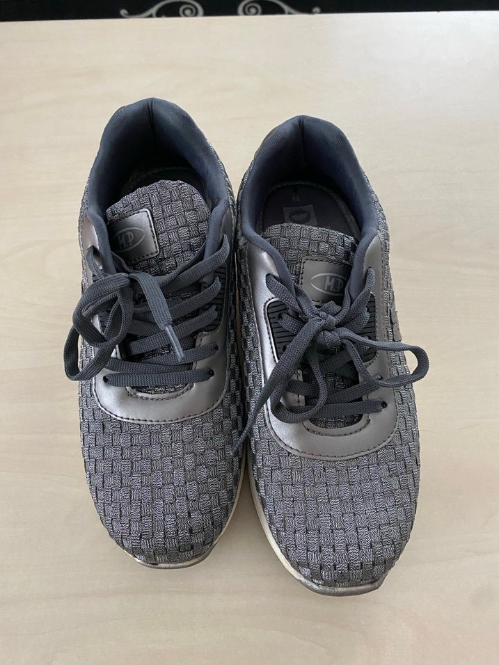 Yılan desenli ve elastik detaylı gri kadın spor ayakkabısı. Kauçuk malzemeden yapılmış, blok topuklu ve günlük sokak stili için uygundur.