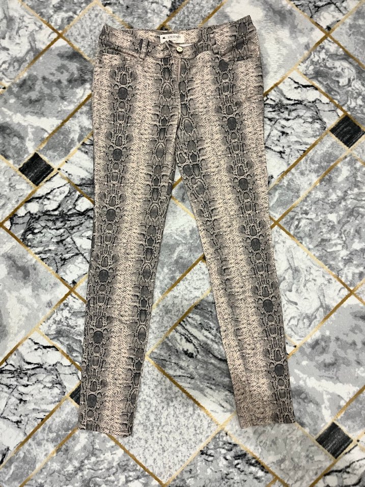 Sentetik kumaştan üretilmiş, gri yılan desenli ve kürk detaylı, vücuda oturan kadın kot pantolon. Sokak stili ve açık hava için uygun.