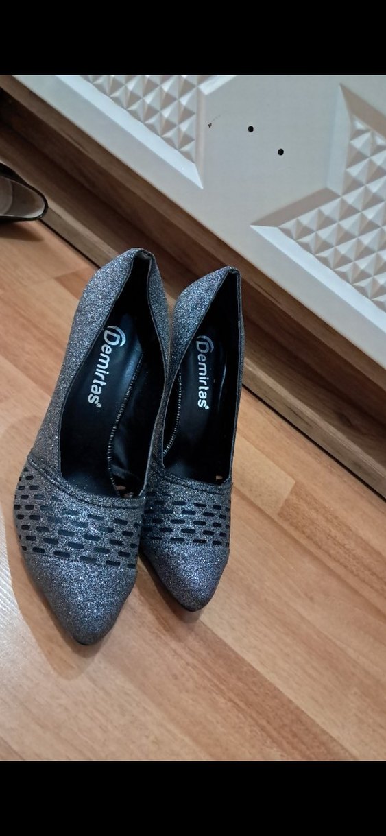 Gri dolgu topuklu, yılan desenli ve pileli abiye kadın ayakkabısı, kauçuk malzemeden üretilmiştir. Düğün ve şık etkinlikler için uygundur.
