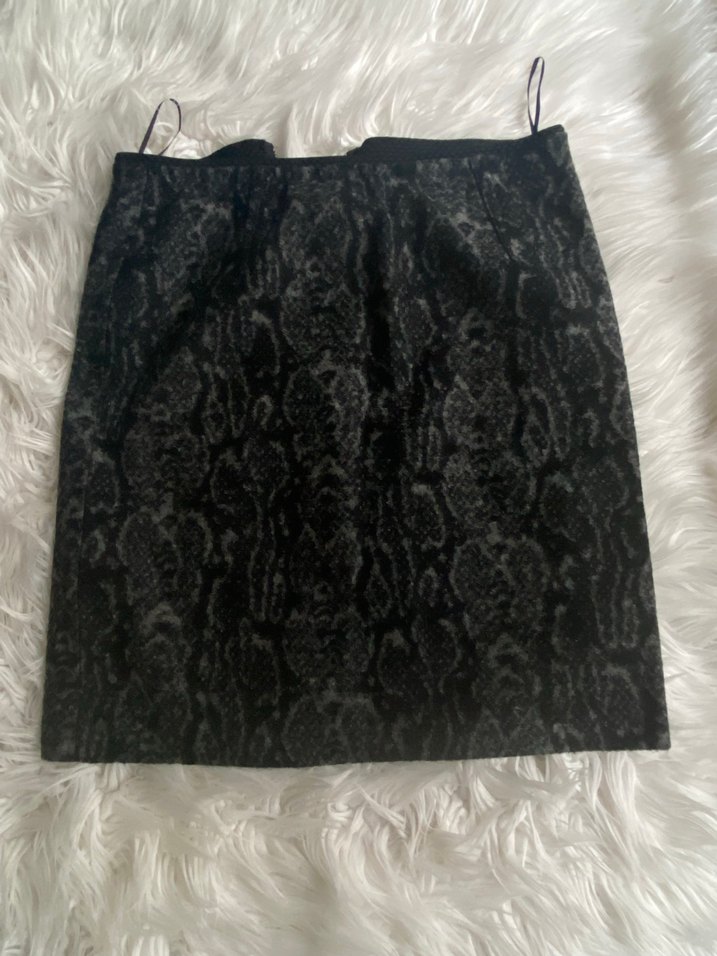 Sentetik kumaştan yapılmış, koyu yılan desenli ve kürk detaylı, vücuda oturan gri mini etek. Cesur gotik tarzı ve ofis kullanımı için uygundur.