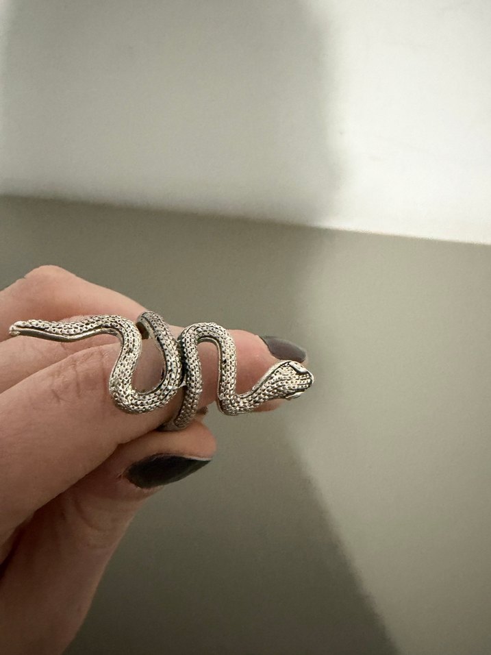 Gri renkte, yılan desenli ve bağcık detaylı kadın yüzüğü. Minimalist ve rock punk tarzını yansıtır, günlük kullanıma uygundur.