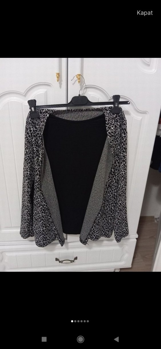Gri yılan desenli, kısa boy, bol kesim kadın hırka. V yaka, uzun kollu ve kemerli tasarıma sahip, günlük ve sokak stiline uygun. boy 63cm iki koltk altı 50 cm