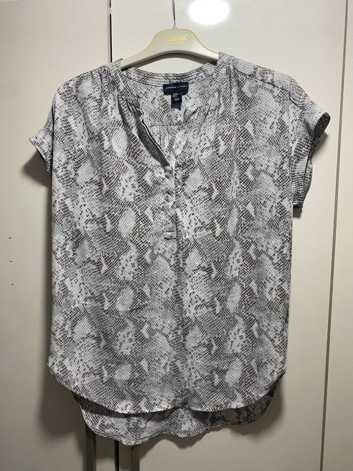 Gri yılan desenli, kısa kollu, V yakalı, düğmeli ve bol kesim kadın bluz. Yumuşak sentetik kumaştan, günlük rahat sokak stili için uygundur.