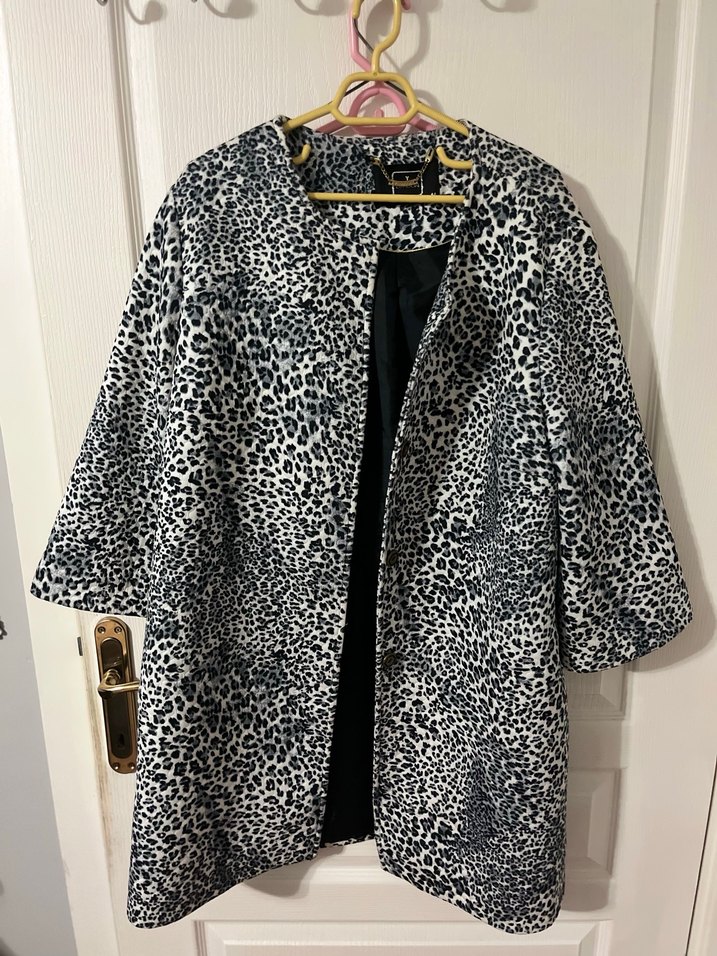 Gri yılan desenli kadın kaban, bol kesim ve kürklü yakasıyla dikkat çeker. Uzun kollu, midi boy ve yumuşak sentetik kumaştan üretilmiştir.