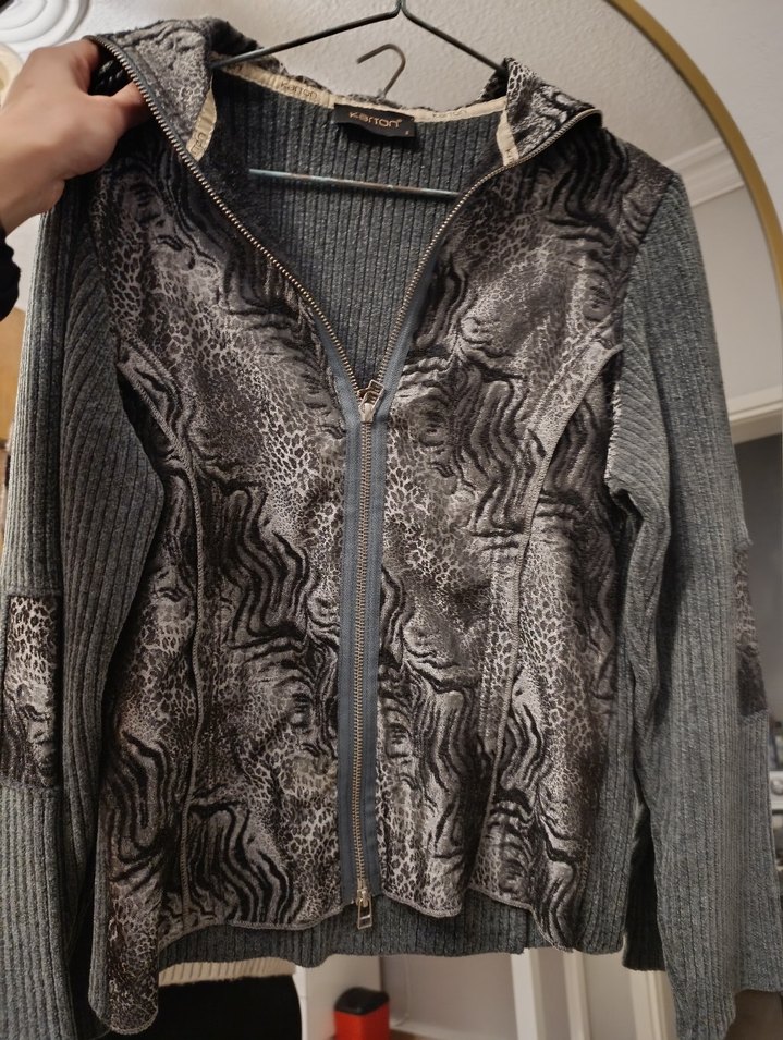 Gri yılan desenli triko ceket, yüksek yakalı ve uzun kollu, kürk detaylı, rahat ve şık sokak stili sunar.