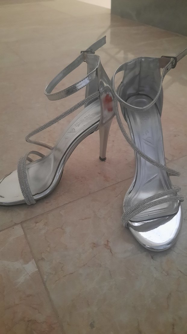 Gri yılan deseni ve metal görünümlü stiletto topuklu ayakkabı, tokalı ince bantlarla süslenmiştir. Düğün ve özel geceler için uygundur. topuk boyu 10 cm