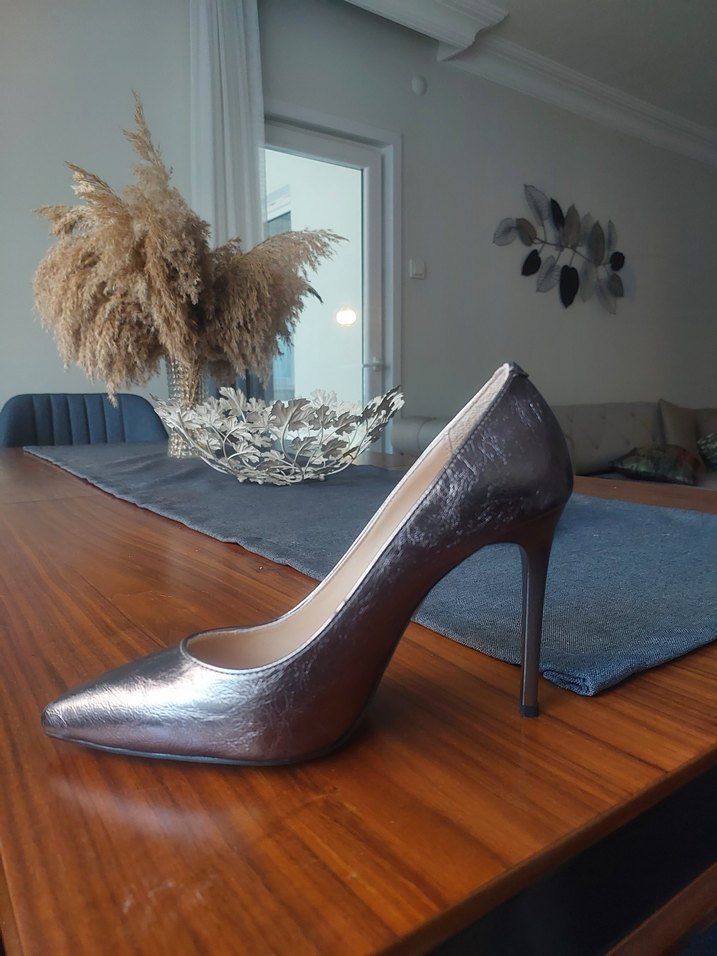 Gri yılan desenli parlak metal görünümlü stiletto topuklu kadın ayakkabısı, tokalı detaylarla ofis şıklığı sunar.