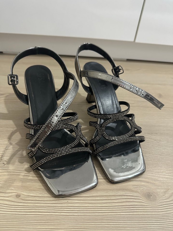 Gri yılan desenli kayışlara ve metal tokalı detaylara sahip stiletto topuklu kadın ayakkabısı, romantik akşamlar için uygun. ✨