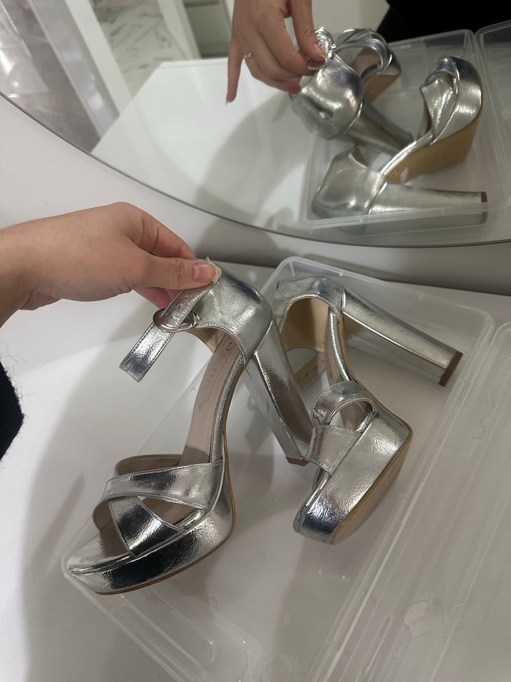 Gri yılan desenli, metalik platform topuklu, tokalı kadın ayakkabısı, çağdaş ve göz alıcı tasarımıyla düğünler için uygun.