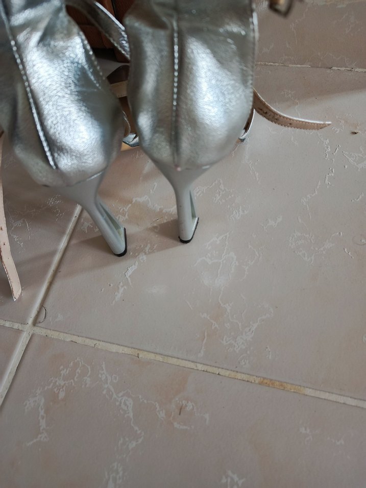 Gri yılan desenli, metal stilettolu, tokalı kadın abiye ayakkabılar, düğün için uygundur.