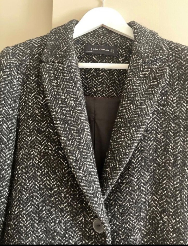 Gri yılan desenli kadın kaban, yün kumaştan, düğmeli ve notched yakalıdır. Normal kesim, uzun kollu ve midi boydadır. Ofis ve günlük stil için uygundur.