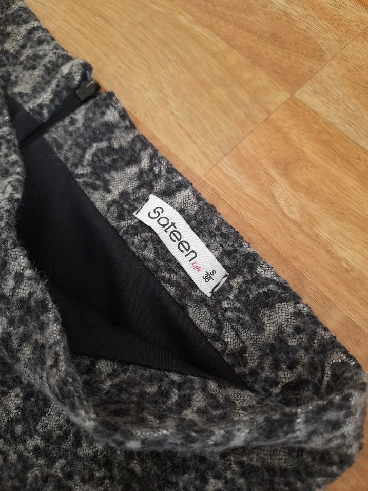 Gri yılan desenli, sentetik kumaştan yapılmış, fermuarlı ve bol kesim kısa hamile eteği. Rahat ve şık sokak stili için uygundur.