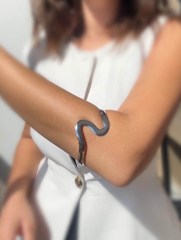 Gri renkte yılan desenli, modern ve şık kesime sahip kadın bileklik, günlük kullanıma uygundur.