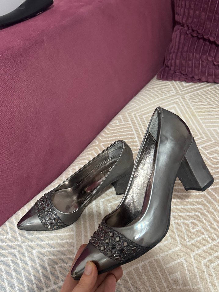 Gri yılan desenli ve payet detaylı, kauçuk malzemeden blok topuklu kadın ayakkabısı, ofis için uygun .38 numara çok rahat