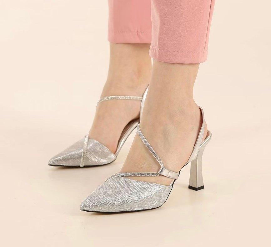 Gri yılan desenli, payetli metal malzemeden yapılmış ince topuklu ayakkabılar. Ofis için uygun, çağdaş ve klasik zarafet tarzını yansıtır.