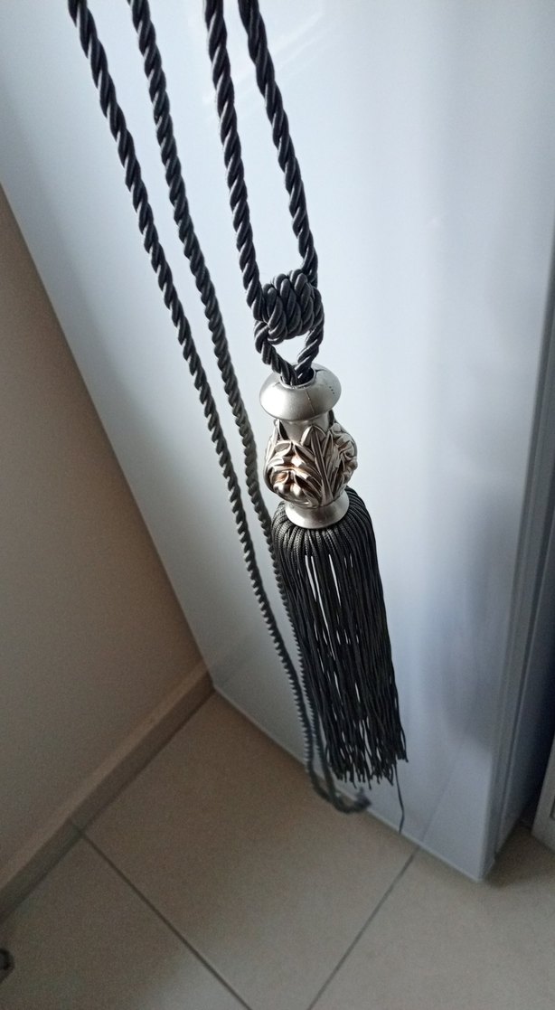 Geleneksel tarzda, yılan desenli gri perde bağı, dekoratif püskülle tamamlanmıştır.