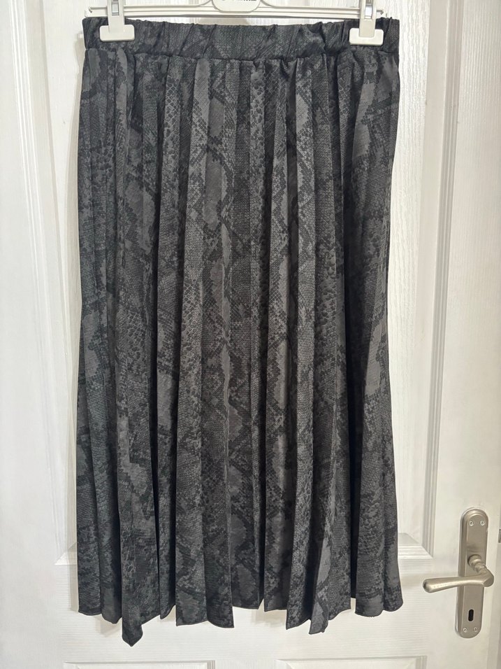 Gri yılan deseni ve pilili tasarıma sahip, sentetik kumaştan üretilmiş uzun ve bol kesim etek. Şık stil ve ofis kullanımı için uygundur.