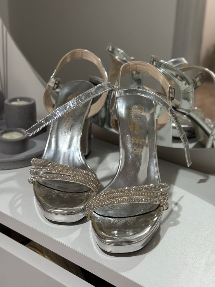 Gri yılan desenli platform topuklu, metal malzemeden, tokalı kayışlı abiye ayakkabı. Düğün ve şık etkinlikler için modern ve gösterişli tarzda.
