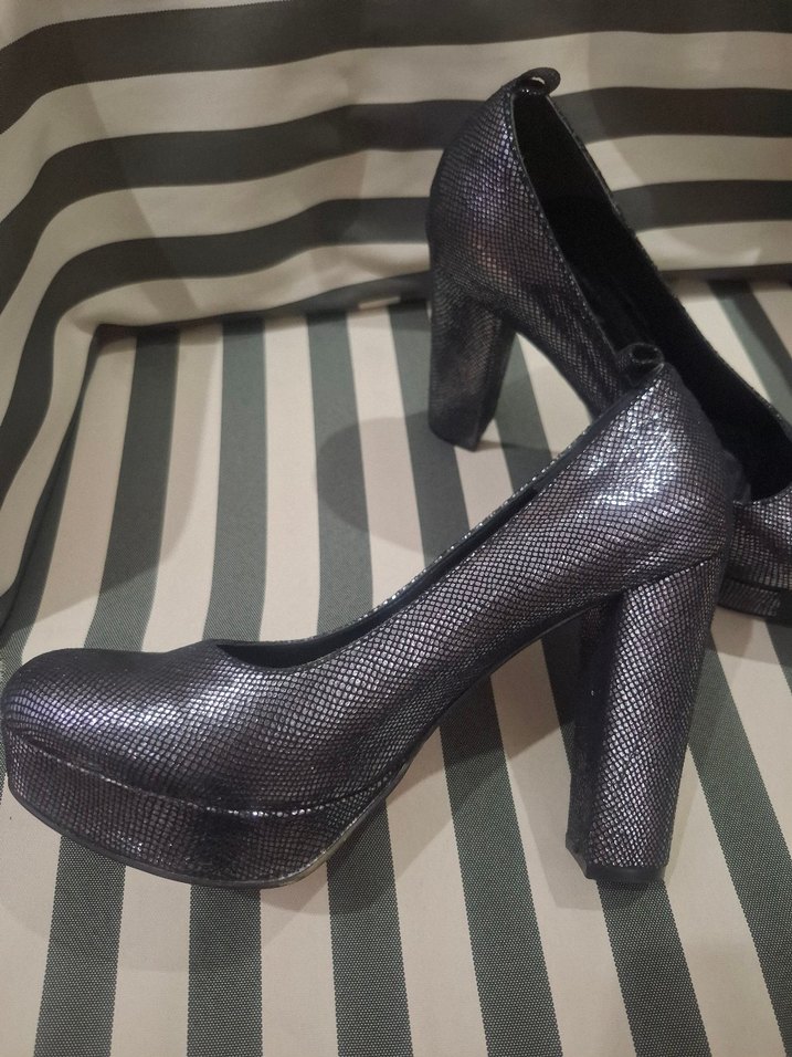 Gri yılan desenli platform topuklu ayakkabılar, lastik malzemeden ve pileli dokudadır. Partiler için şık ve gotik tarzda uygundur.