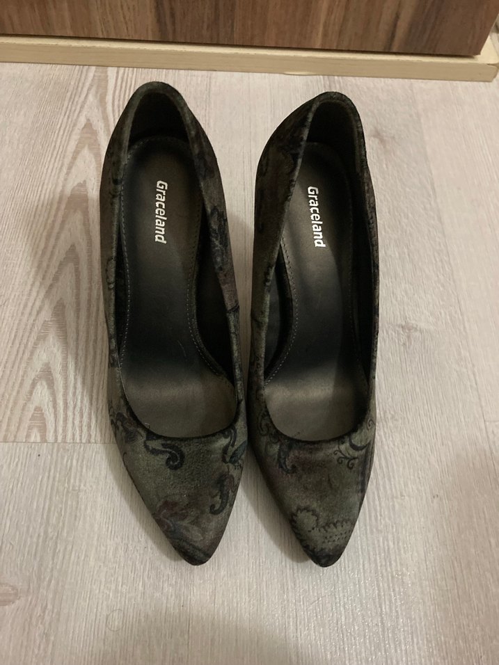 Gri yılan desenli, tokalı platform topuklu kadın stiletto. Graceland markasına ait, kauçuk tabanlı ve ofis kullanımı için uygun.