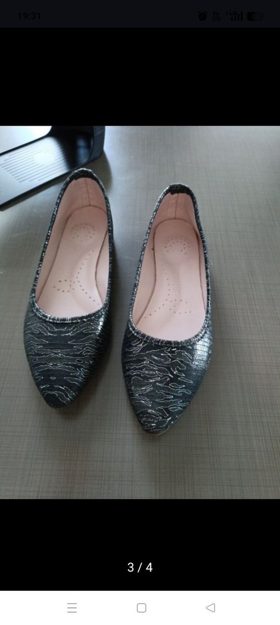 Yılan desenli, gri renkte, pileli detaylara sahip stiletto topuklu babet, klasik zarafeti modern tarzla buluşturuyor.