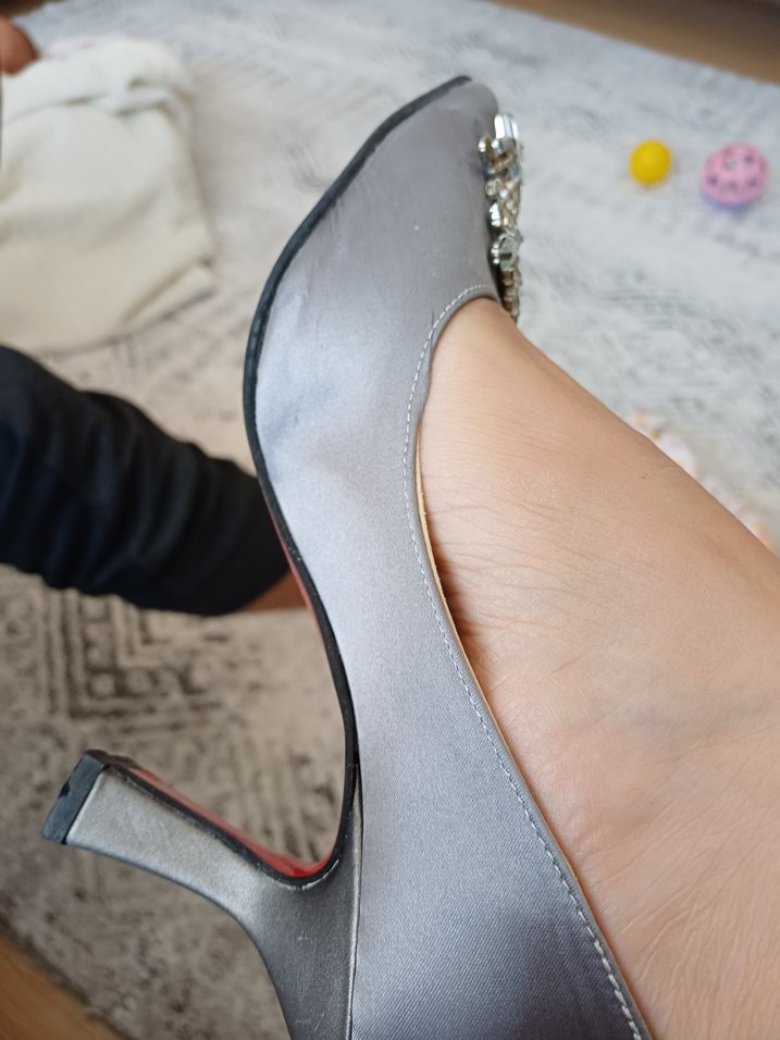 Gri yılan desenli stiletto topuklu, tokalı ve kauçuk malzemeden yapılmış kadın ayakkabısı. Düğün için uygun, çağdaş tarzda.