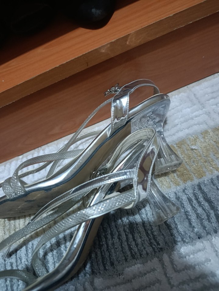 Gri yılan desenli, tokalı bantlı, stiletto topuklu kadın ayakkabısı. Lastik malzemeden, düğün ve özel günler için uygun, çağdaş tarzda.