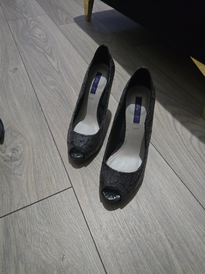Gri yılan desenli, plise detaylı stiletto topuklu kadın ayakkabısı. Kauçuk malzemeden üretilmiş, ofis için uygun klasik ve çağdaş bir tasarım.
