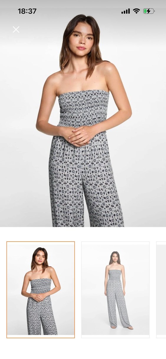 Gri, yılan desenli straplez tulum, pamuk kumaştan, günlük kullanıma uygun rahat ve şık bir modeldir.