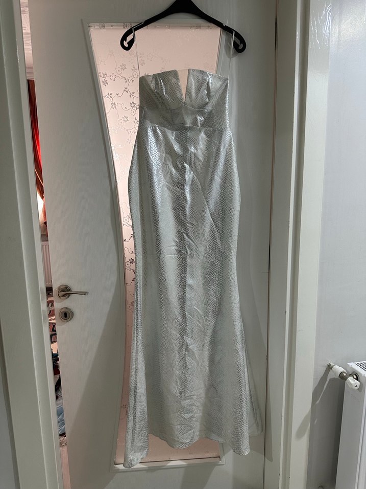 Gri yılan desenli, straplez ve drapeli uzun abiye elbise, düğünler ve modern tarzlar için uygundur. 1 kez giyildi