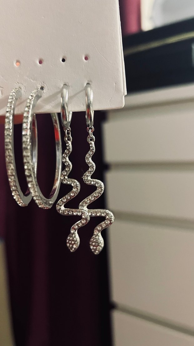Gri yılan desenli, taşlı midi küpeler. Çağdaş minimalist tarzda, rock punk havası taşıyan romantik akşamlar için uygun.