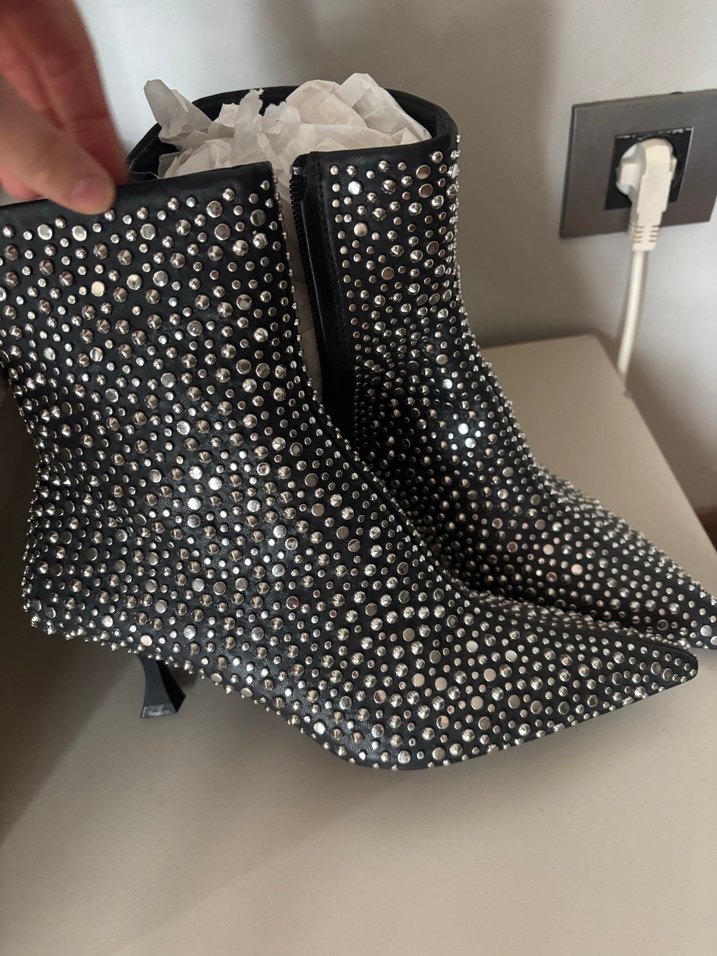 Gri deri kadın bot, stiletto topuklu, yılan desenli ve parlak taşlarla süslenmiş. Cesur, avangart tarz için uygun.