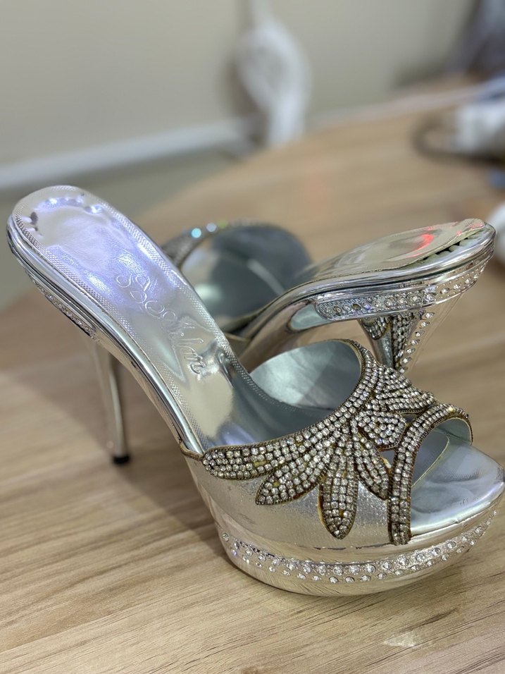 Gri yılan deseni ve taş işlemeli detaylara sahip, parlak yüksek topuklu abiye ayakkabılar, düğün ve özel anlar için uygundur.