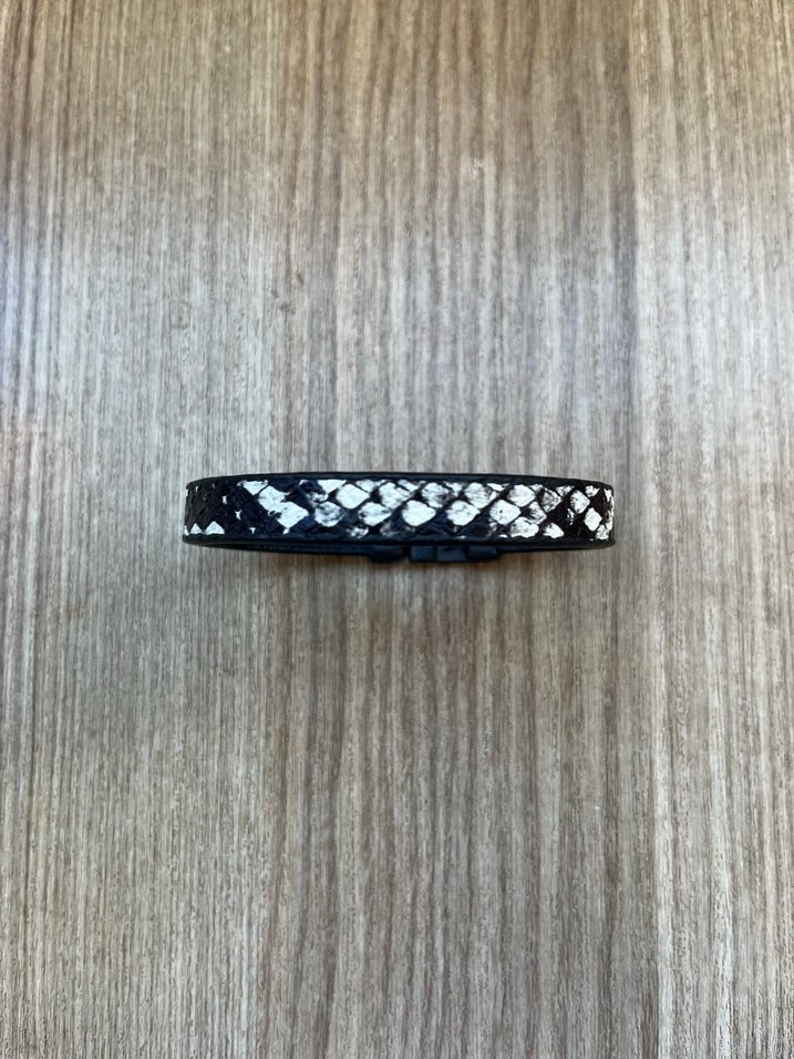 Gri yılan deseni ve tokalı kapanışıyla minimalist, çağdaş tarza sahip bileklik. Günlük kullanıma uygundur.