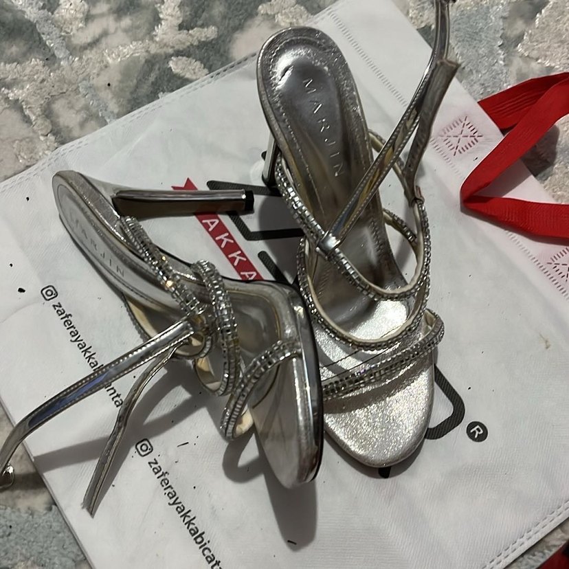Gri yılan desenli ince topuklu, tokalı kayışlarla parti için çağdaş ve göz alıcı tarzda kadın ayakkabısı.