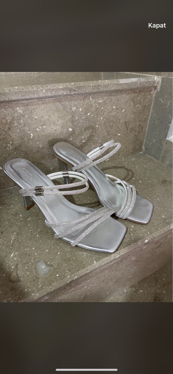 Gri yılan deseni ve tokalı askıları olan metal malzemeden yapılmış ince topuklu ayakkabılar. Düğün gibi özel anlara uygundur.