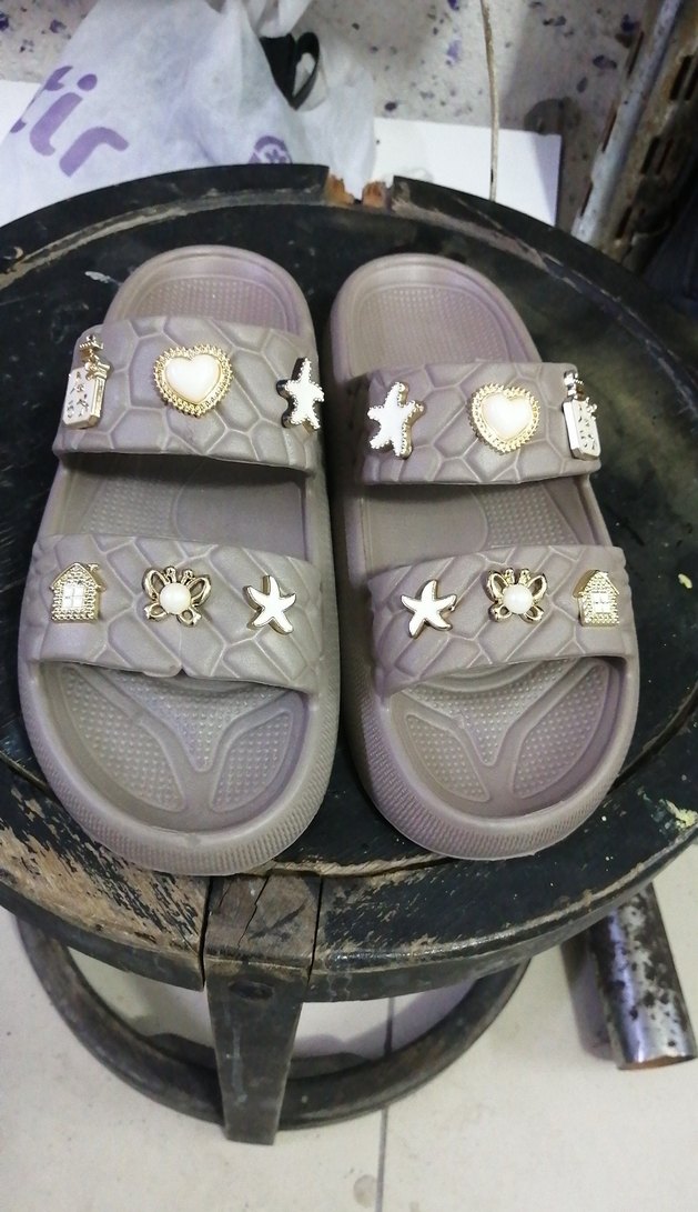 Gri yılan desenli kauçuk kadın terlikler, tokalı bantlarla platform topuklu. Şık ve rahat, günlük sokak stili için uygun.