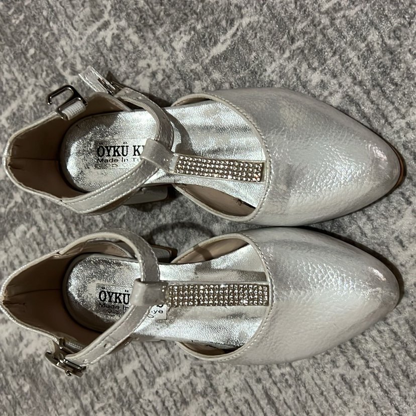 Gri yılan desenli, metal tokalı kız özel ayakkabısı. Taş detaylı şık ve çağdaş tasarım. ÖYKÜ K. imzalı.