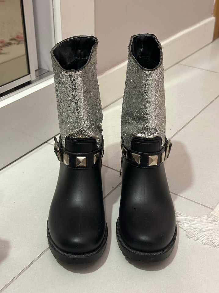 Gri yılan desenli, tokalı ve blok topuklu kauçuk botlar, sokak modası ve rock punk tarzını yansıtıyor.