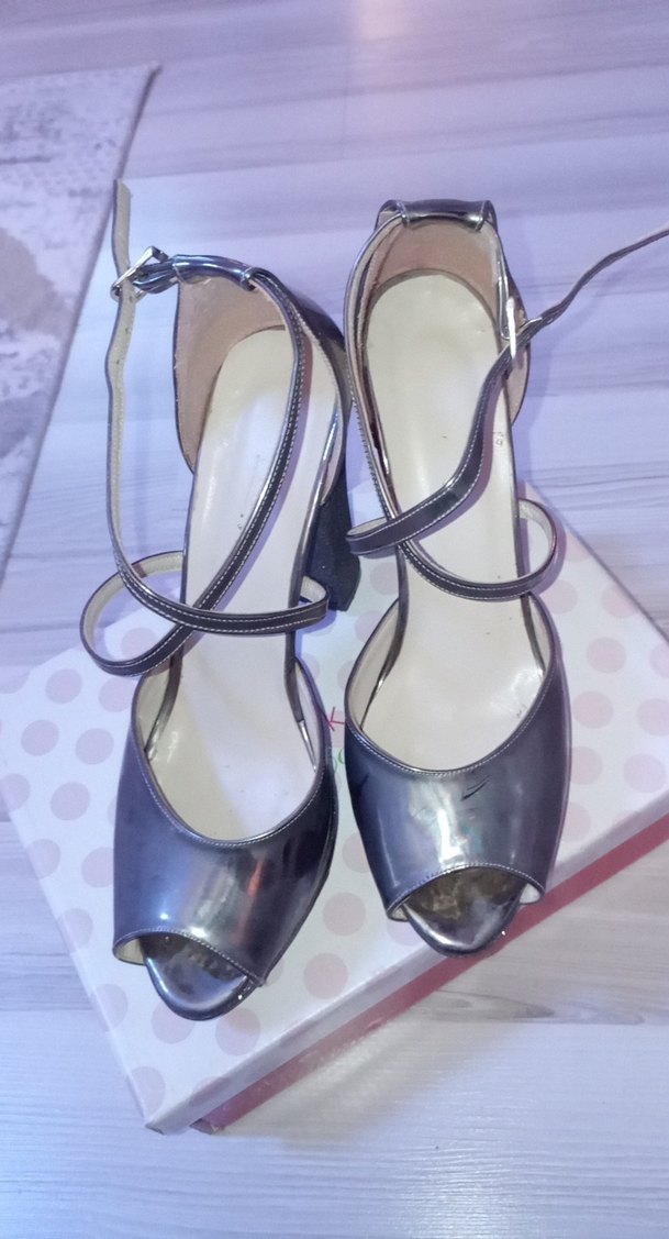Gri yılan desenli, tokalı kayışlı stiletto topuklu ayakkabılar, kauçuk malzemeden üretilmiştir. Günlük kullanıma uygun şık ve çağdaş tasarım.