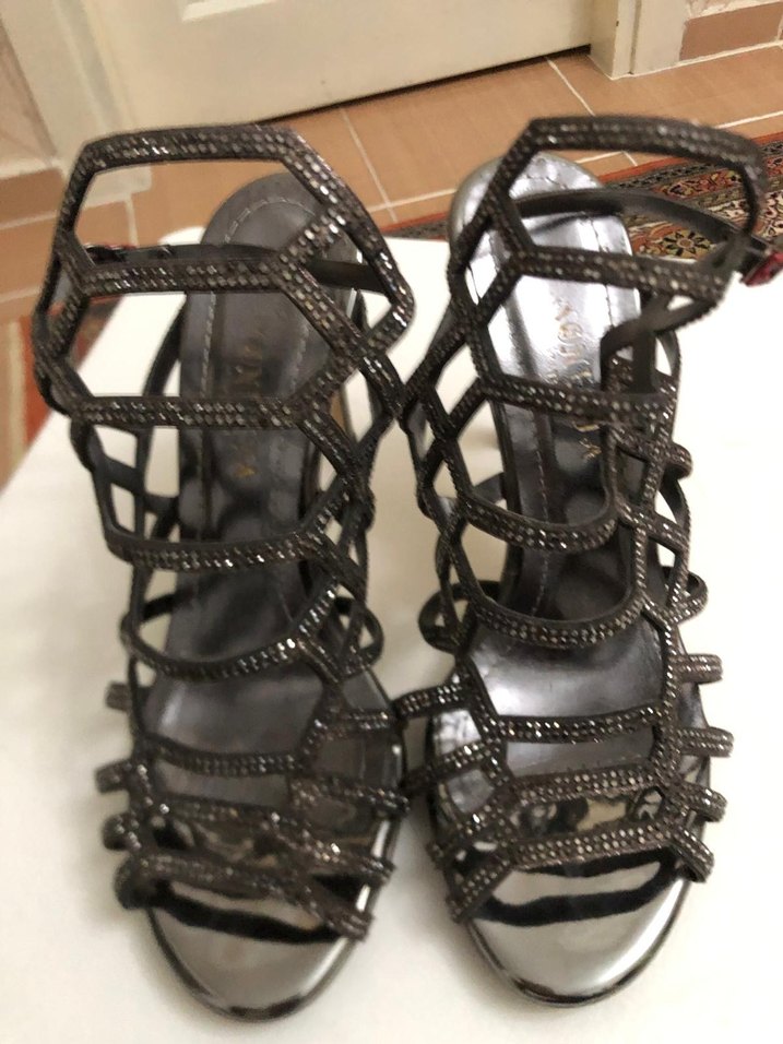 Gri yılan desenli, tokalı, kauçuk malzemeden yapılmış yüksek topuklu kadın ayakkabıları, gotik ve avangart tarzda romantik akşam buluşmaları için uygun.