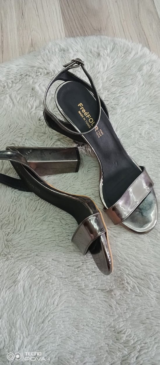 Gri yılan desenli, tokalı kayışlı, blok topuklu kadın ayakkabısı. Kauçuk malzemeden yapılmış, cesur ve çağdaş bir tarza sahip.