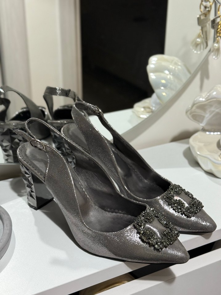 Gri yılan desenli tokalı topuklu kadın ayakkabısı, metal topuklu ve modern klasik tasarıma sahiptir. Düğünler için uygundur.