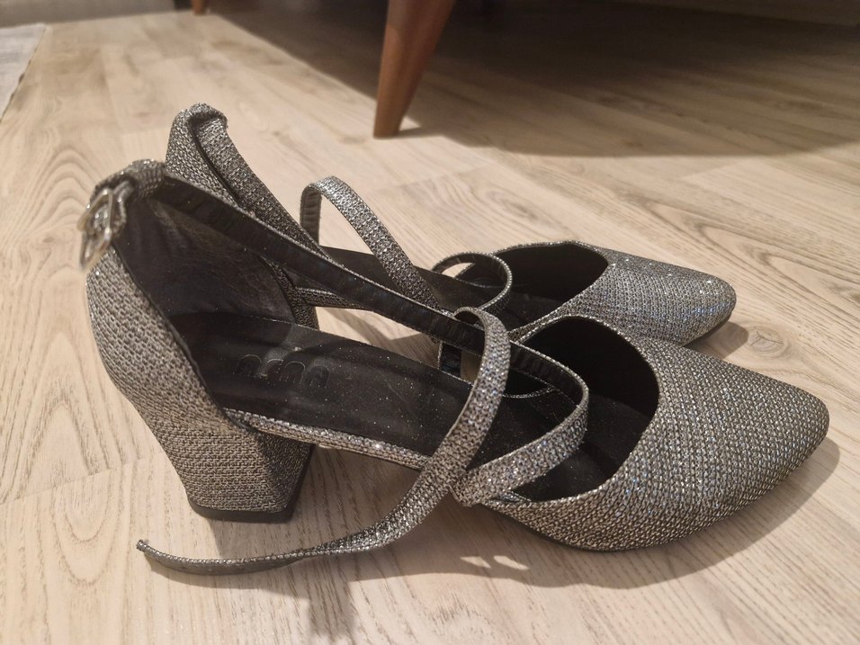 Gri yılan desenli kadın ayakkabısı, topuklu ve tokalı şeritlere sahip. Modern tarzıyla romantik akşamlar için uygun.