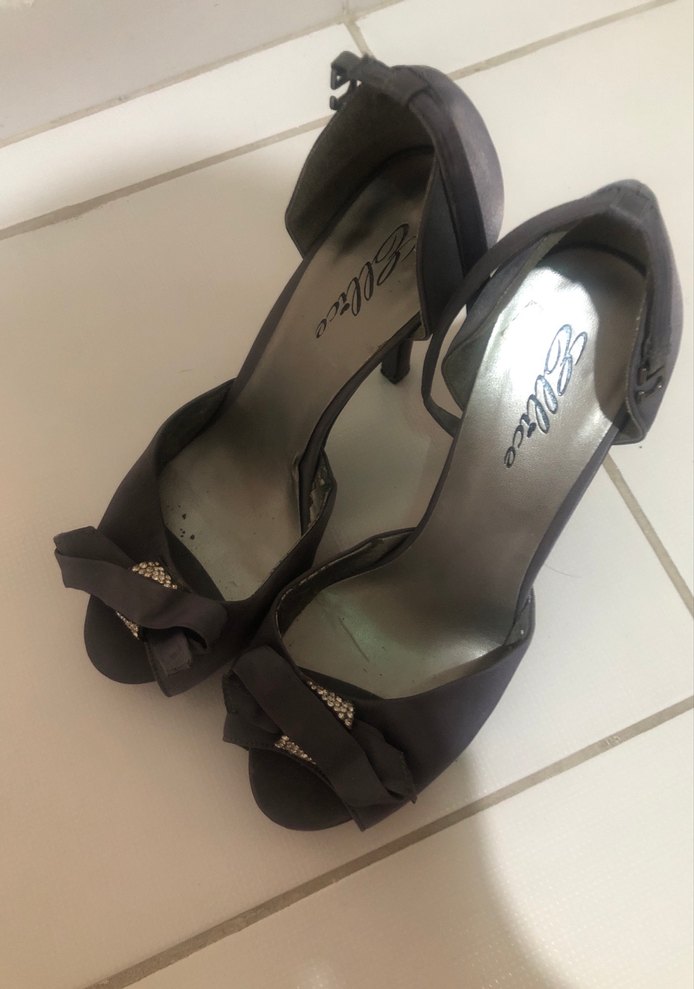 Gri saten desenli stiletto topuklu, tokalı bantlı kadın ayakkabısı. Minimalist ve klasik zarafet stilinde, romantik akşamlar için uygun.