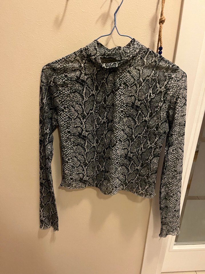 Yılan desenli, boğazlı ve uzun kollu dar kesim kadın bluz. Transparan detaylı, midi boyda, yumuşak sentetik kumaştan, günlük sokak stili için uygun.