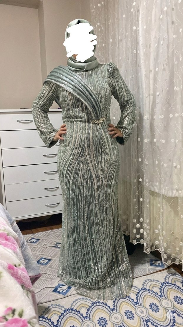 Yılan desenli gri uzun abiye elbise, yüksek yakalı ve uzun kolludur. Drapeli detaylarla şık ve modern bir görünüm sunar. 1 defa kullanıldı sal dahildir