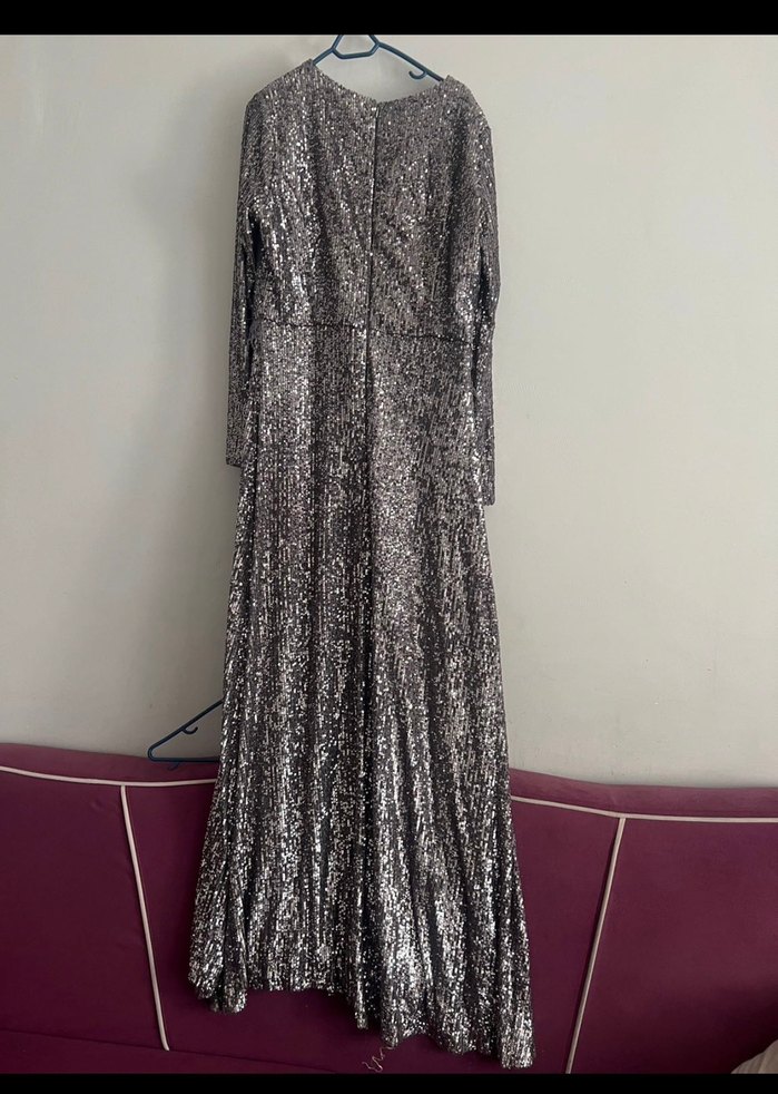 Pullu gri desenli uzun abiye elbise, v yaka ve uzun kollu, drapeli kesimiyle şık ve modern bir görünüm sunar.