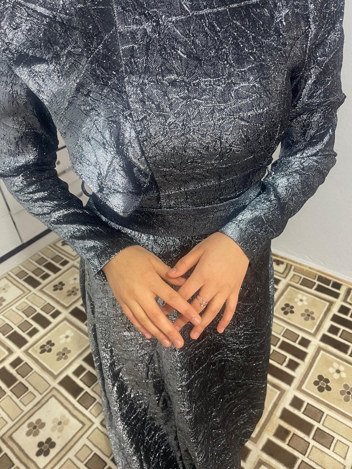 Yılan desenli, yüksek yakalı, uzun kollu ve drapeli gri uzun abiye elbise, şık ve modern bir görünüm sunar.