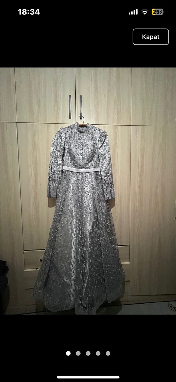 Yılan desenli, gri renkte, uzun kollu, yüksek yakalı ve drapeli kesime sahip, dar kesim uzun abiye elbise. Avant-garde tarz ve düğünler için uygundur.